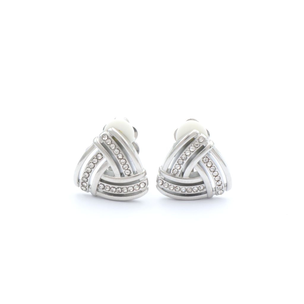 Ατσάλινα σκουλαρίκια με κλιπ (κατάλληλα και για μη τρυπημένα αυτιά) σε ασημί χρώμα. Τριγωνικό σχέδιο διακοσμημένο με στρας, και άνετο κούμπωμα κλιπ.