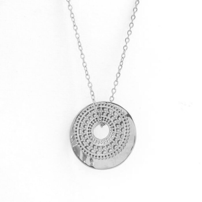 Κοντό ατσάλινο κολιέ ασημί χρώματος, με αλυσιδάκι και δύο δίσκους που πέφτει ο ένας πάνω στον άλλο δημιουργώντας ένα υπέροχο αποτέλεσμα, από ανοξείδωτο ατσάλι.