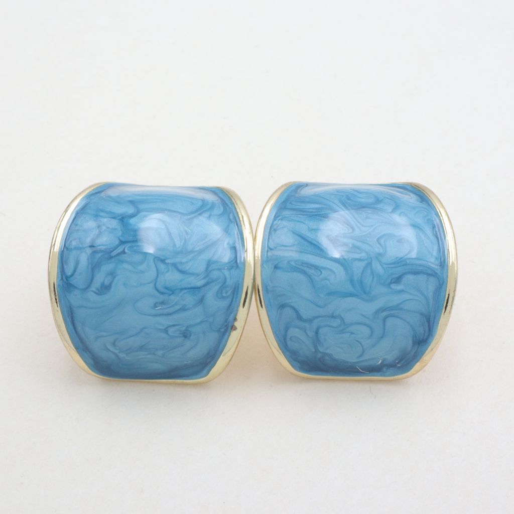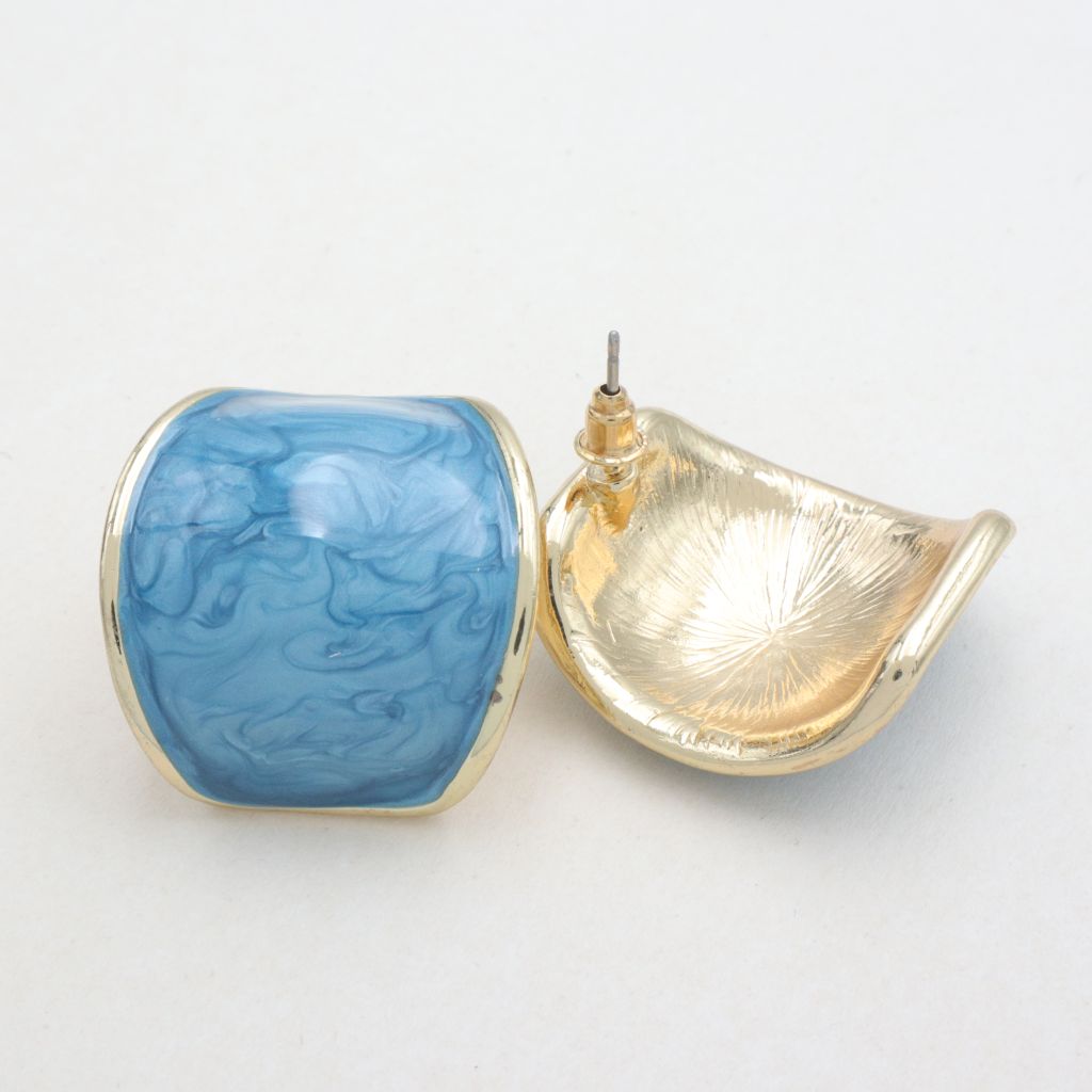 Μπλε κυρτά σκουλαρίκια που είναι μεγάλα αλλά όχι υπερβολικά. Τα σκουλαρίκια διαθέτουν στρογγυλή μεταλλική (nickel-free) βάση χρυσού χρώματος, και είναι διακοσμημένα με μωβ ζωγραφισμένη επιφάνεια που θυμίζει μάρμαρο. Είναι ελαφριά, ευκολοφόρετα και συνδυάζονται με κάθε στυλ.
