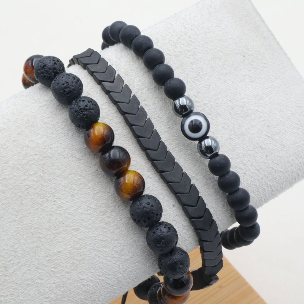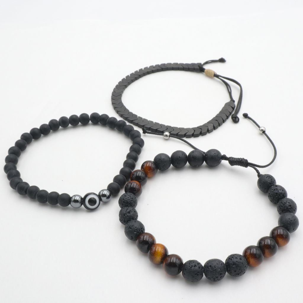 Σετ από 3 διαφορετικά ανδρικά βραχιόλια με μάτι της τίγρης και λάβα.