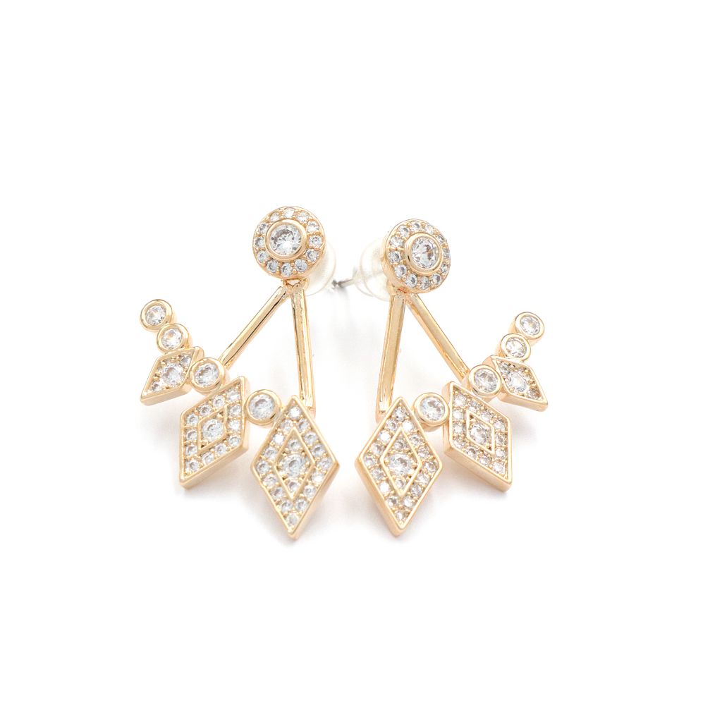 Σκουλαρίκια σε χρυσό χρώμα με καρφάκι από ασήμι 925, αλλά και κρεμαστό μέρος το οποίο τοποθετείται στο πίσω μέρος και φαίνεται σαν να αγκαλιάζει το κάτω μέρος του λοβού του αυτιού. Διακοσμημένα με μικρά και μεγάλα κρυσταλλάκια και στρασάκια που χαρίζουν περισσότερη λάμψη στις εμφανίσεις σας.