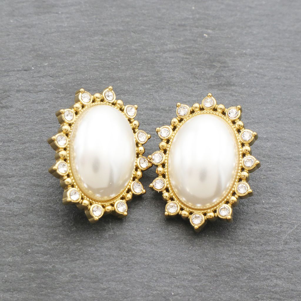 Ατσάλινα σκουλαρίκια με κλιπ (κατάλληλα και για μη τρυπημένα αυτιά) σε χρυσό χρώμα. Μεγάλα οβάλ σκουλαρίκια με οβάλ πέρλα και περιμετρική διακόσμηση με μικρά στρας. Κομψά και λαμπερά, για τα πιο ιδιαίτερα ντυσίματά σας. Με άνετο κούμπωμα clip.