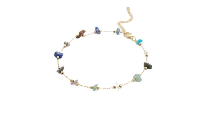 Λεπτή ατσάλινη αλυσίδα ποδιού, σε χρυσό χρώμα, με μικρές πέτρες σε διαφορετικά χρώματα. Οι πέτρες σε κάθε αλυσίδα είναι διαφορετικά χρώματα, με τυχαία επιλογή.