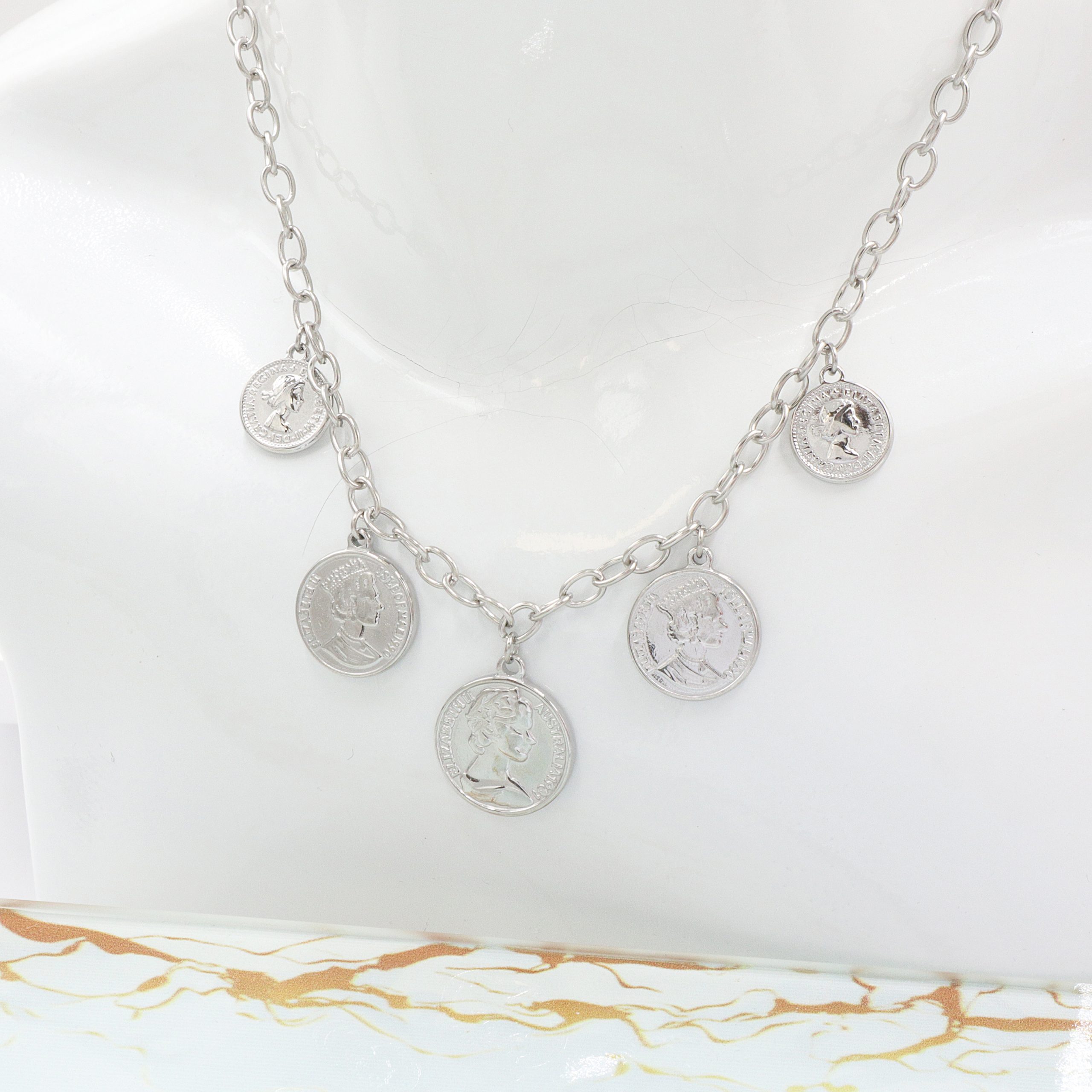 Ατσάλινο κολιέ με φλουριά νομίσματα, ασημί