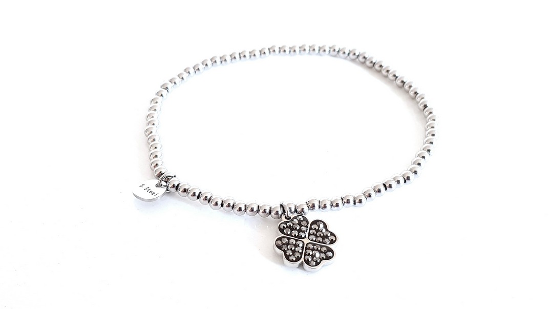 Ελαστικό βραχιόλι από ατσάλινες μικρές χάντρες, σε ασημί χρώμα, με κρεμαστό ατσάλινο τριφύλλι με ανθρακί στρας.
