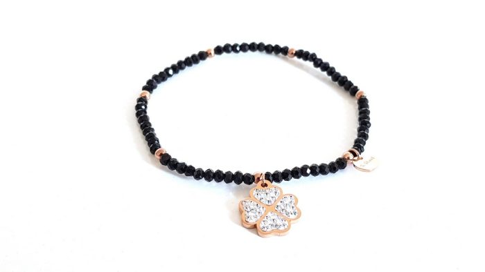 Ελαστικό βραχιόλι από μαύρες κρυστάλλινες και ροζ χρυσές ατσάλινες χάντρες, με κρεμαστό ατσάλινο τριφύλλι με λευκά στρας.