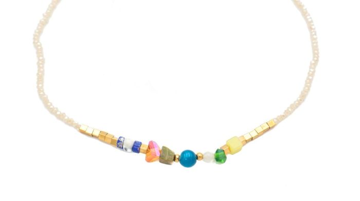 Κοντό ατσάλινο κολιέ διακοσμημένο με ζαχαρί χάντρες, χρυσά στοιχεία και διάφορες πέτρες. Διαθέτει αλυσιδάκι επέκτασης.
