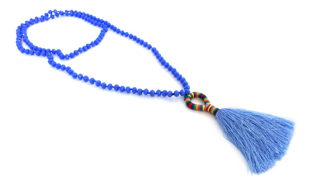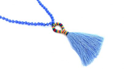 Μακρύ χειροποίητο κολιέ από κρυστάλλινες σιέλ χάντρες δεμένες πάνω σε κορδόνι, διακοσμημένο με μεγάλη χρωματιστή φούντα. Μπορεί να φορεθεί διπλό ή πολύ μακρύ σαν μονό, ενώ συνδυάζεται εύκολα με άλλα κολιέ σε boho στυλ.