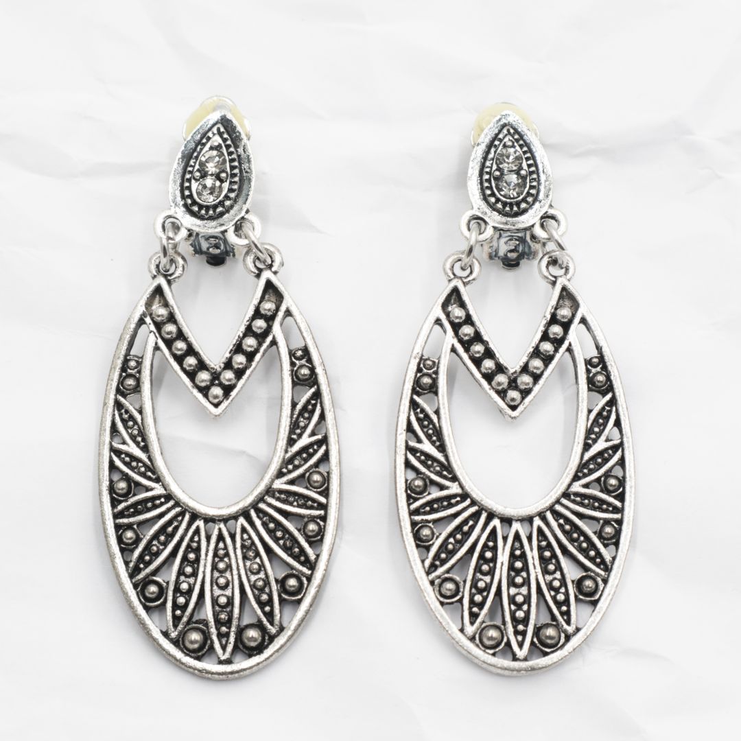 Κρεμαστά σκουλαρίκια με κλιπ (κατάλληλα για μη τρυπημένα αυτιά), σε παλαιωμένο ασημί χρώμα, με οβάλ σχήμα και 2 μικρά λευκά στρας στο πάνω μέρος.