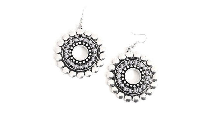 Στρογγυλά κρεμαστά σκουλαρίκια με γάντζο, σε ασημί αντικέ χρώμα, αποτελούμενα από μικρότερα στρογγυλά μεταλλικά στοιχεία και μικρές γκρι χάντρες.