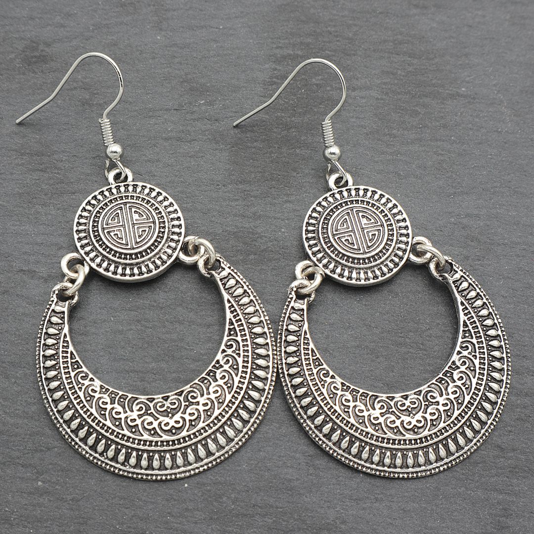 Kρεμαστά boho σκουλαρίκια, σε ασημί αντικέ χρώμα.