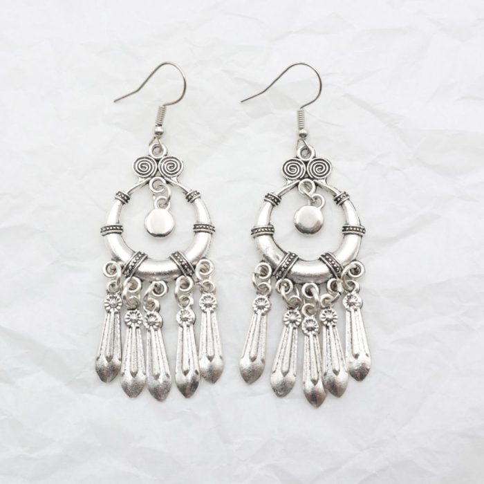 Kρεμαστά boho σκουλαρίκια, σε ασημί αντικέ χρώμα, με κυκλικό στοιχείο από το οποίο κρέμονται πιο μικρά στοιχεία σε σχήμα λόγχης.