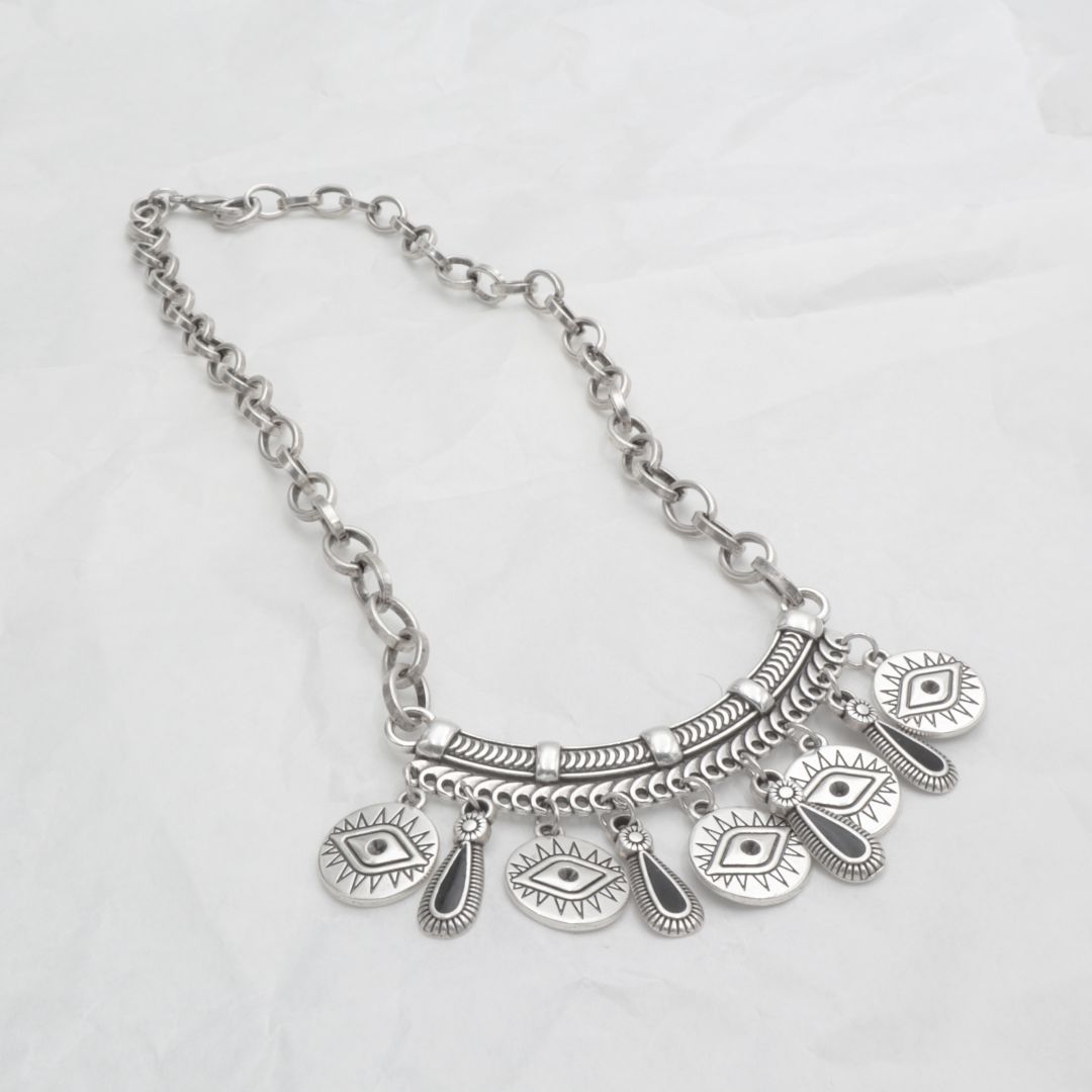 Κοντό boho κολιέ από επαργυρωμένα στοιχεία και αλυσίδα. Αποτελείται από καμπυλωτό ανάγλυφο στοιχείο από το οποίο κρέμονται στοιχεία με ανάγλυφα μάτια και δάκρυα με μαύρο σμάλτο.