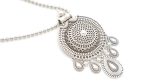 Μακρύ boho κολιέ από επαργυρωμένα στοιχεία σε ασημί χρώμα, διακοσμημένο με μεγάλο ανάγλυφο κυκλικό στοιχείο στο κέντρο, από το οποίο κρέμονται δάκρυα.