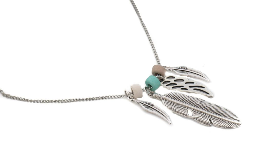 Boho κολιέ από επαργυρωμένα στοιχεία σε ασημί χρώμα, διακοσμημένο με 4 φτερά διαφορετικού μεγέθους και κεραμικές χάντρες.