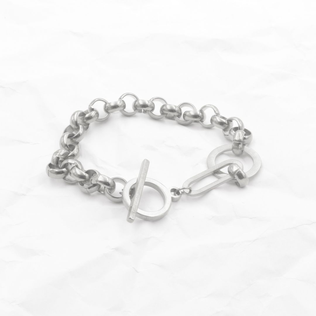 Ατσάλινο βραχιόλι με χοντρή αλυσίδα, και 3 στοιχεία που λειτουργούν και σαν θέσεις για να κουμπωθεί με ατσάλινη ασημί μπαρίτσα, σε ασημί χρώμα.