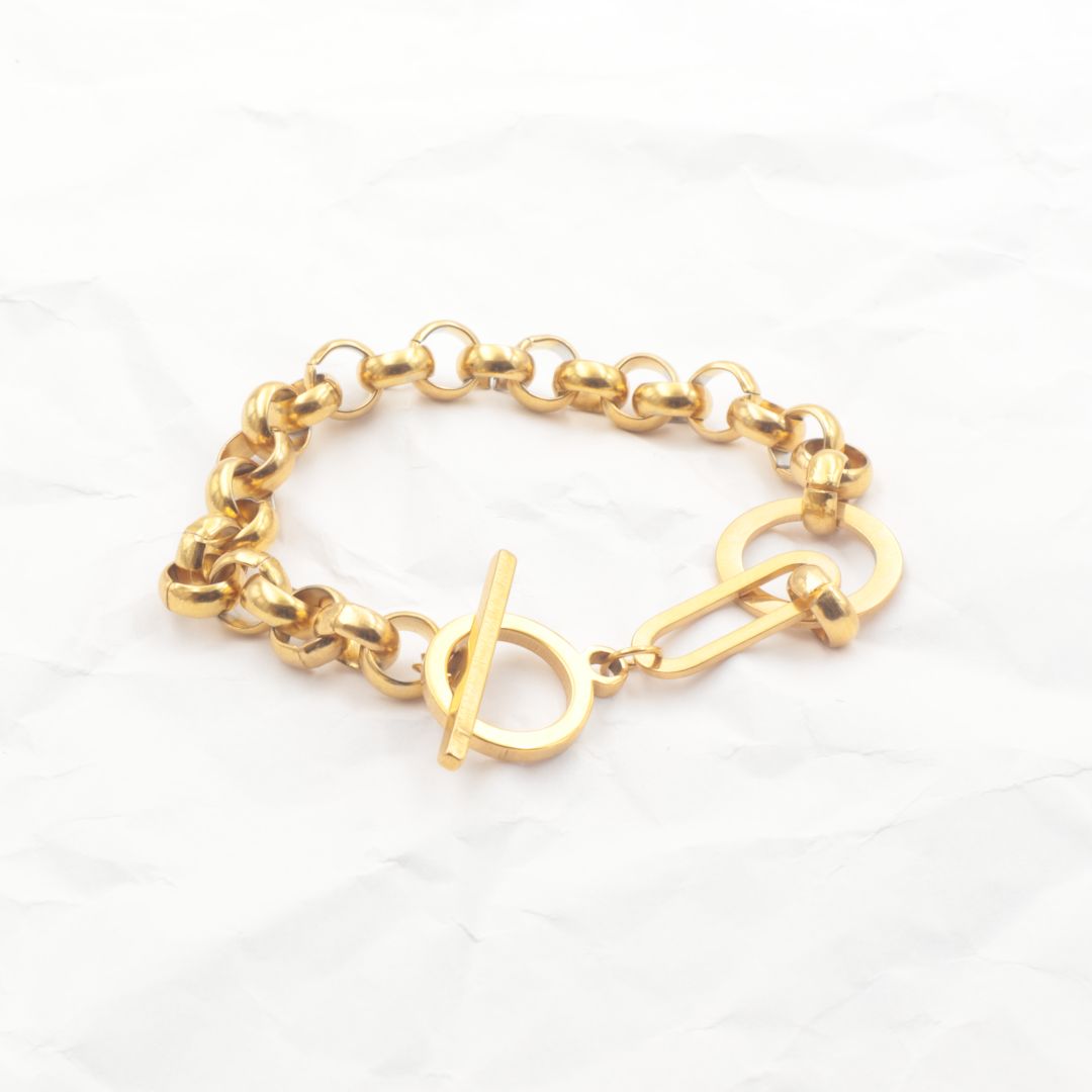 Ατσάλινο βραχιόλι με χοντρή αλυσίδα, και 3 στοιχεία που λειτουργούν και σαν θέσεις για να κουμπωθεί με ατσάλινη χρυσή μπαρίτσα, σε χρυσό χρώμα.