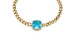 Ατσάλινο βραχιόλι αλυσίδα σε χρυσό χρώμα, με γαλάζιο τετράγωνο κρυσταλλάκι στο κέντρο. Κούμπωμα με παπαγαλάκι. Διαθέτει αλυσιδάκι επέκτασης ώστε να προσαρμόζεται στον καρπό.
