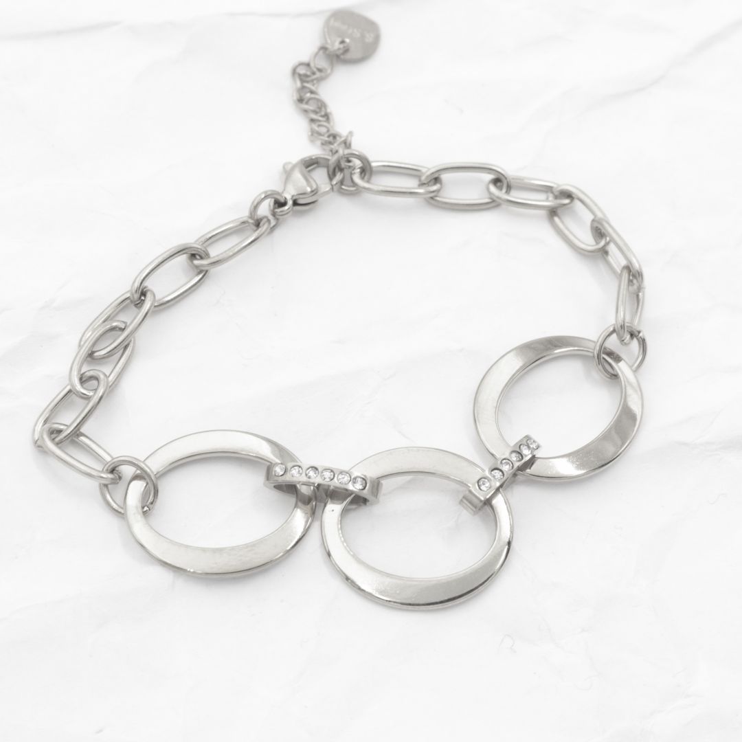 Ατσάλινο βραχιόλι με αλυσίδα και 3 οβάλ κρίκους που ενώνονται με κρίκους που φέρουν λευκά στρασάκια, σε ασημί χρώμα. Κούμπωμα με παπαγαλάκι. Διαθέτει αλυσιδάκι επέκτασης.