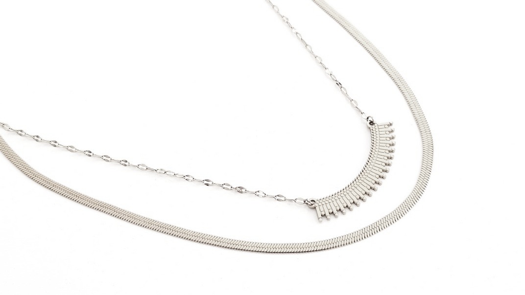 Ατσάλινο διπλό κολιέ, με πλακέ αλυσίδα και λεπτή αλυσίδα με ημικυκλικό στοιχείο. Διαθέτει αλυσιδάκι επέκτασης.