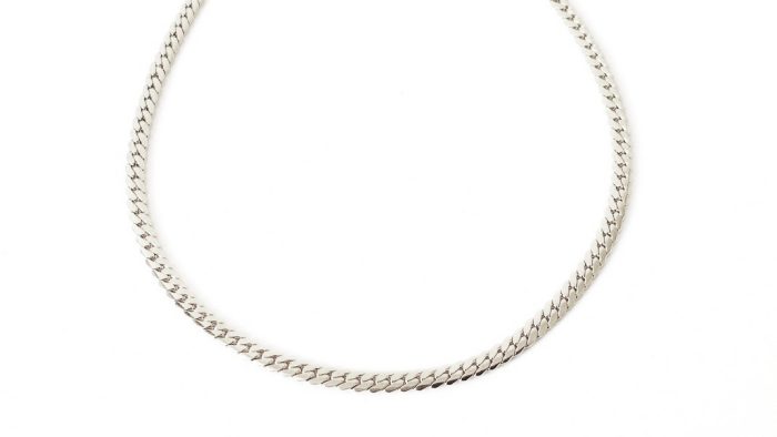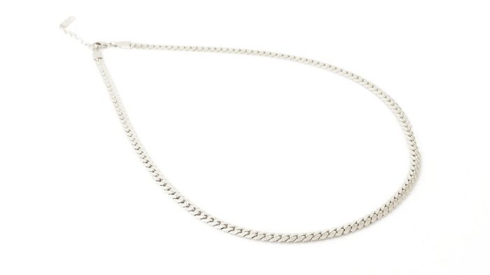 Κοντό ατσάλινο κολιέ από πλακέ πυκνή αλυσίδα, σε ασημί χρώμα. Διαθέτει αλυσιδάκι επέκτασης.
