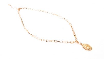 Κοντό ατσάλινο κολιέ από χοντρή αλυσίδα σε ροζ χρυσό χρώμα, διακοσμημένο με οβάλ στοιχείο με βασίλισσα. Διαθέτει αλυσιδάκι επέκτασης.