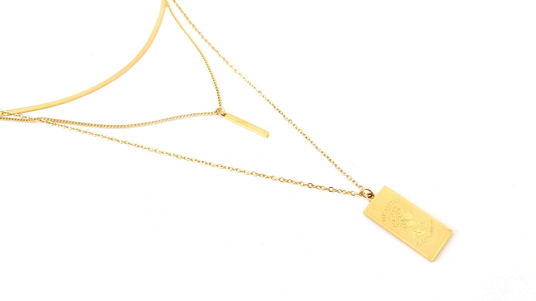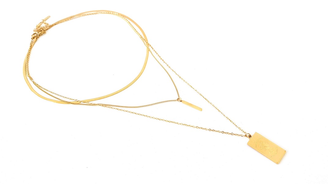 Ατσάλινο τριπλό κολιέ, με 3 διαφορετικές αλυσίδες (οι 2 με κοινό κούμπωμα και η τρίτη η πλακέ με ξεχωριστό κούμπωμα) και κρεμαστά στοιχεία (μπάρα και ορθογώνιο μενταγιόν με βασίλισσα). Διαθέτουν αλυσιδάκια επέκτασης.