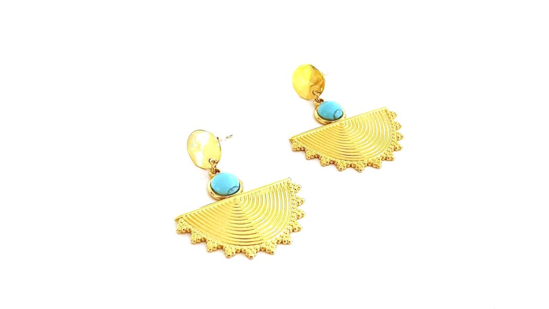 Ατσάλινα boho σκουλαρίκια με καρφάκι, σε χρυσό χρώμα, με γαλάζια πέτρα και ημικυκλικό σχέδιο με “δαντελωτό” τελείωμα.