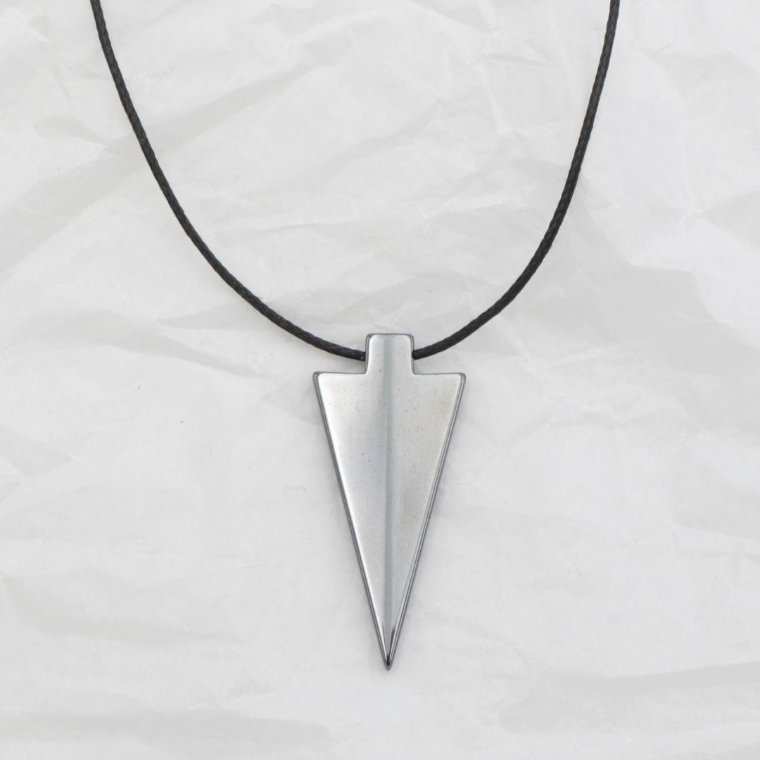 Χειροποίητο μακρύ κολιέ με κρεμαστό βέλος από αιματίτη και μαύρο ανθεκτικό κορδόνι. Συνδυάζεται εξαιρετικά με τα ανδρικά βραχιόλια από αιματίτη της νέας μας συλλογής.
