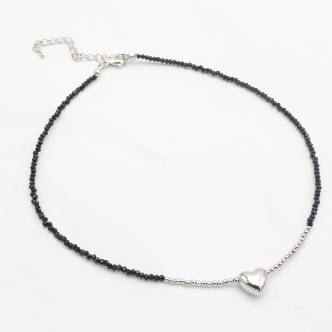 Κοντό ατσάλινο κολιέ με μαύρα κρυσταλλάκια και ασημί χάντρες και καρδιά. Διαθέτει αλυσιδάκι επέκτασης.