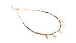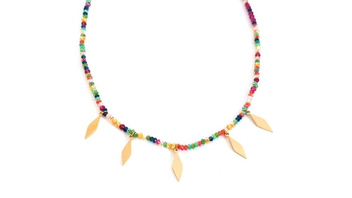 Κοντό κολιέ από πολύ ψιλές πολύχρωμες κρυστάλλινες χάντρες και λεπτή ατσάλινη αλυσίδα, με κρεμαστά στοιχεία σε σχήμα ρόμβου σε χρυσό χρώμα. Διαθέτει ατσάλινο αλυσιδάκι επέκτασης.