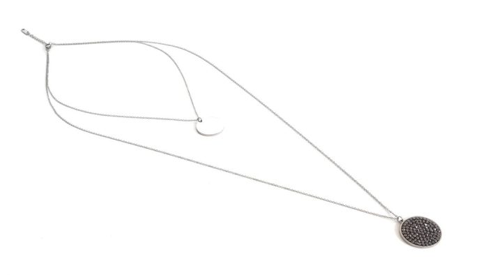 Διπλό ατσάλινο κολιέ σε ασημί χρώμα, από λεπτές αλυσίδες, με κρεμαστά στρογγυλά στοιχεία. Το στοιχείο στο μακρύ μέρος είναι διακοσμημένο με γκρι στρας.