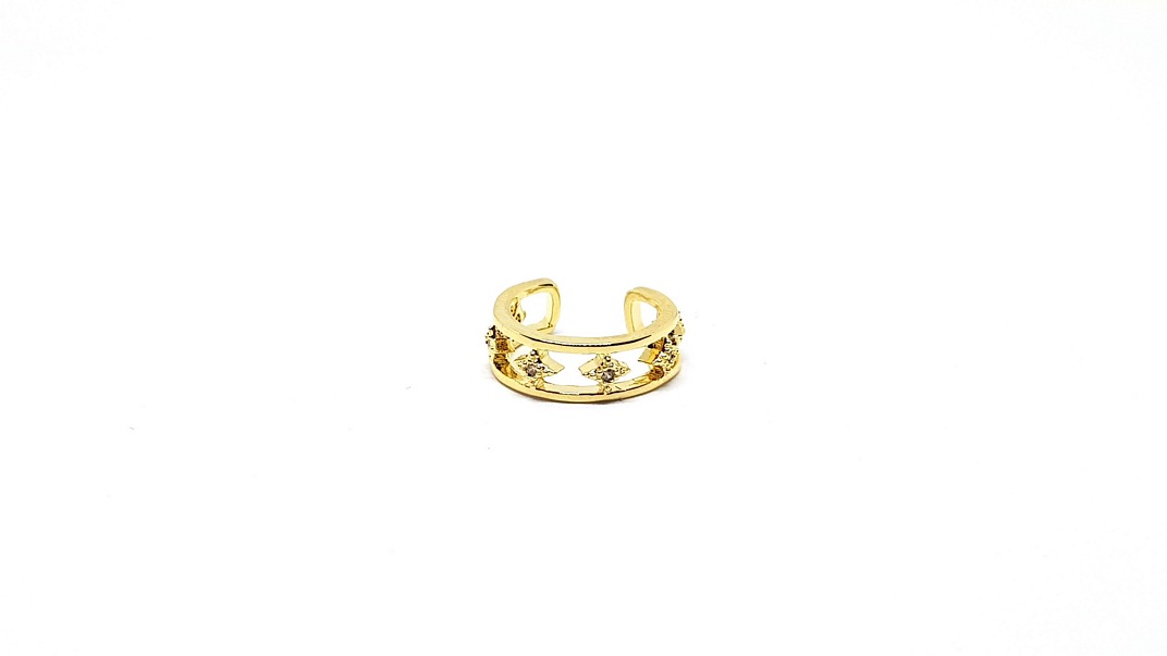 Σκουλαρίκι με αστέρια και στρας, σε χρυσό χρώμα (επιχρυσωμένη 18Κ επιφάνεια χαλκού), που φοριέται στο μέσο ή το πάνω μέρος του πτερυγίου του αυτιού. Είναι ανοιχτό στο πίσω μέρος και δεν χρειάζεται τρύπα. Προσαρμόζεται με ελαφριά πίεση στο αυτί.