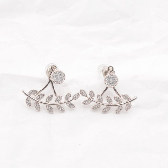 Σκουλαρίκια ear jacket σε ασημί χρώμα με λευκά στρας, με καρφάκι από ασήμι 925, αλλά και κρεμαστό μέρος το οποίο τοποθετείται στο πίσω μέρος και φαίνεται σαν να αγκαλιάζει το κάτω μέρος του λοβού του αυτιού. Διακοσμημένα με ένα κλαδί από στρας και ένα λευκό κρυσταλλάκι.