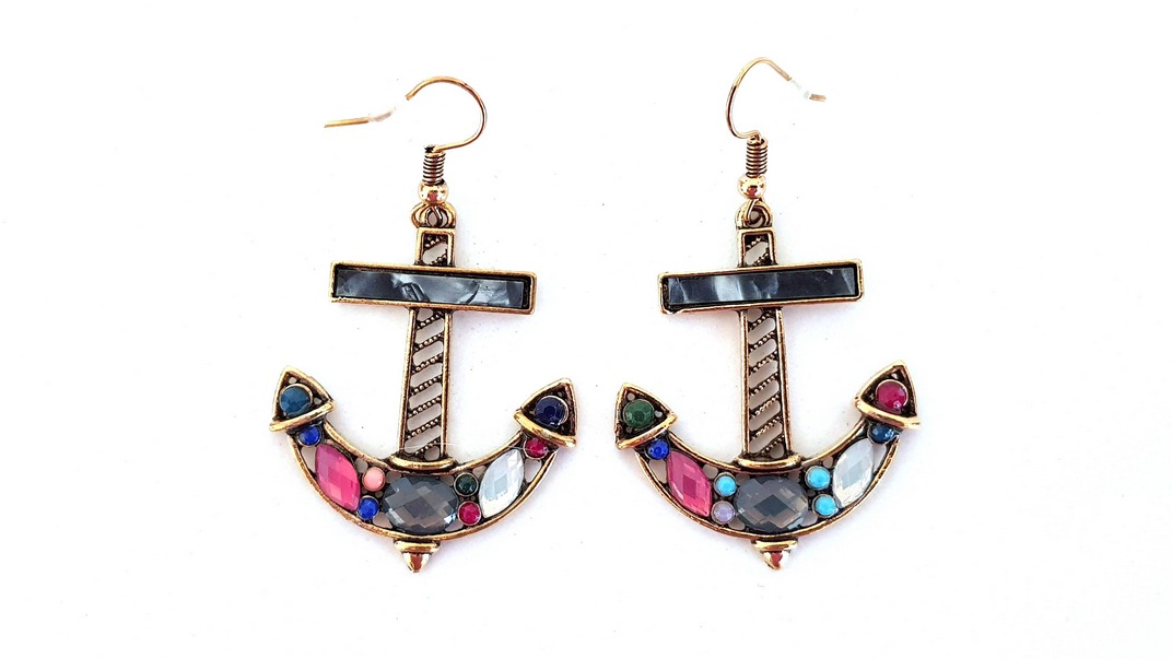Κρεμαστά σκουλαρίκια σε μπρονζέ χρώμα, σε σχήμα άγκυρας, διακοσμημένα με ακρυλικές πέτρες και πολύ ψιλές χάντρες σε έντονα χρώματα.