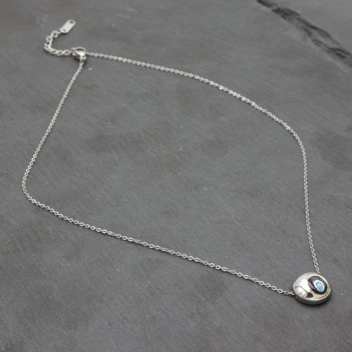 Ατσάλινο κοντό κολιέ με μικρό ματάκι, σε ασημί χρώμα. Κούμπωμα με παπαγαλάκι. Διαθέτει αλυσιδάκι επέκτασης.