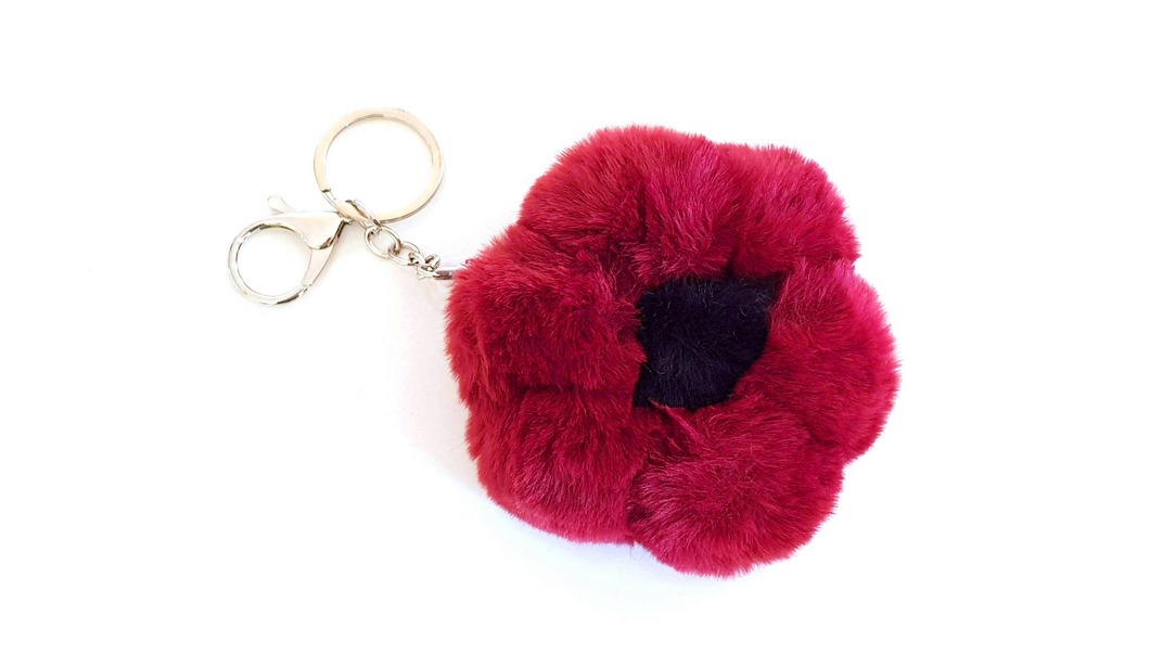 Μπρελόκ από συνθετικό γουνάκι, σε σχήμα μαργαρίτας, με ασημί κρίκο και κούμπωμα-παπαγαλάκι. Μπορεί να χρησιμοποιηθεί και σαν αξεσουάρ για την τσάντα σας.
