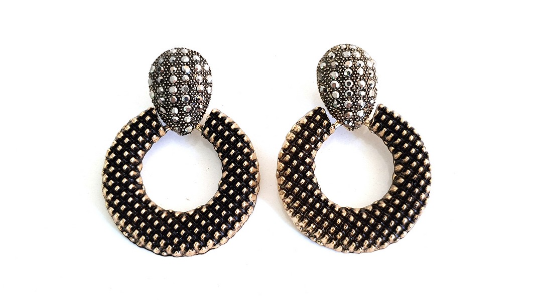 Κρεμαστά εντυπωσιακά σκουλαρίκια με καρφάκι, σε σχήμα κρίκου, σε μπρονζέ χρώμα, διακοσμημένα με γκρι στρας.