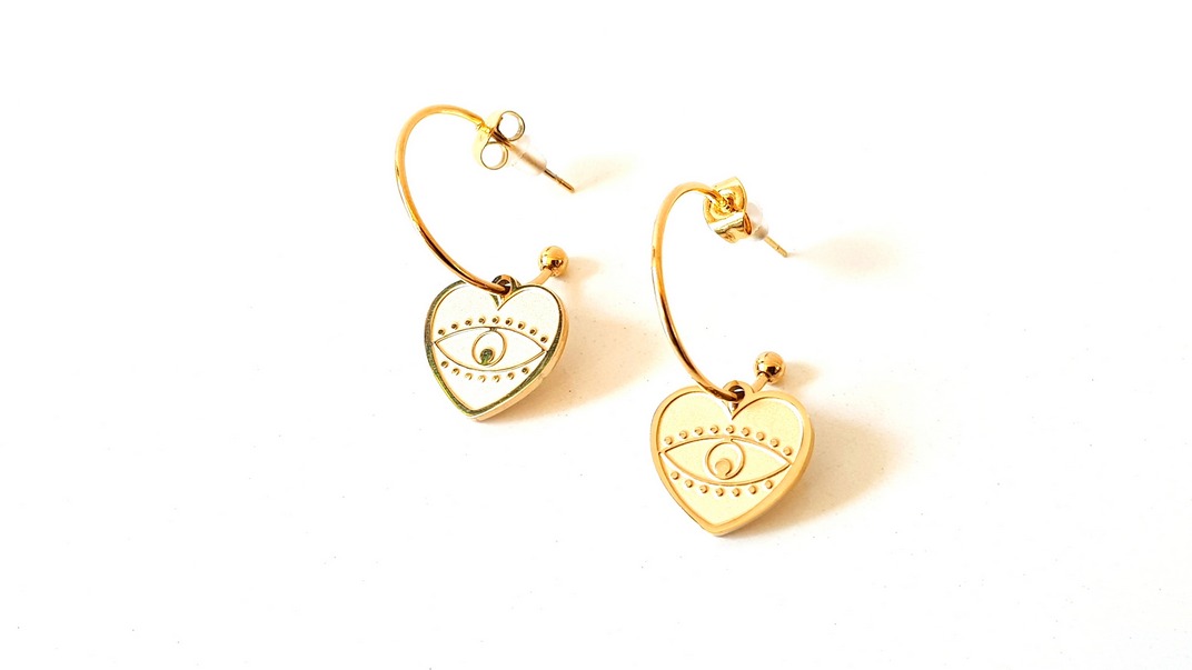 Ατσάλινοι κρίκοι, σε χρυσό χρώμα, με κρεμαστή καρδιά και μάτι στο εσωτερικό.