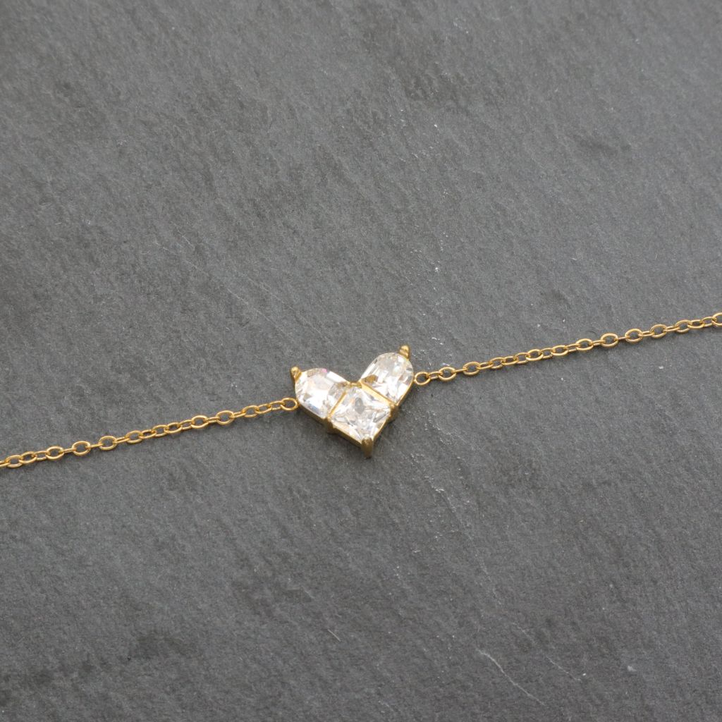Ατσάλινο βραχιόλι με καρδιά φτιαγμένη από 3 κρύσταλλα, σε χρυσό χρώμα. Κούμπωμα με παπαγαλάκι. Το ατσάλι είναι ανοξείδωτο και ανθεκτικό σε νερό και ιδρώτα. Διαθέτει αλυσιδάκι επέκτασης.