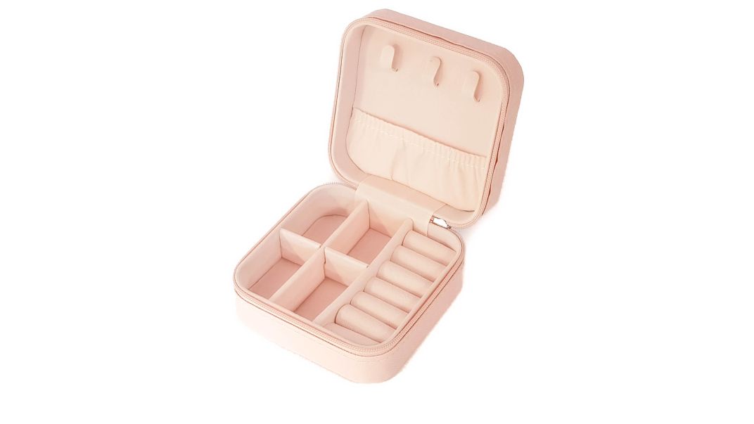 Μικρή μπιζουτιέρα με θήκες για δαχτυλίδια, κολιέ, βραχιόλια, σκουλαρίκια και άλλα μπιζού, σε ροζ χρώμα. Ιδανική για ταξίδια.