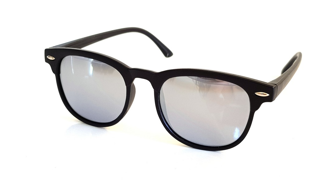 Παιδικά γυαλιά ηλίου σε γραμμή browline, με πολωτικούς φακούς (Polarized) καθρέφτες σε ασημί χρώμα και μαύρο σκελετό.