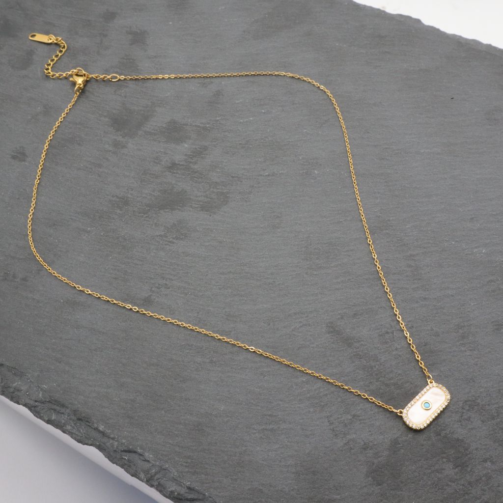 Ατσάλινο κολιέ με γαλάζια χάντρα και όψη φίλντισι και με περιμετρικά στρασάκια. Φτιαγμένο σε κοντό μήκος με αλυσιδάκι επέκτασης, και σε χρυσό χρώμα. Φτιαγμένο από ανοξείδωτο ατσάλι για να είναι ανθεκτικό και να φοράς το αγαπημένο σου κολιέ όσο πιο πολύ γίνεται, και διακοσμημένο με επιφάνεια που γυαλίζει και κάνει ιριδισμούς όπως το υλικό φίλντισι. Κάνε το δικό σου ή χάρισε το για δώρο σε κάποιο αγαπημένο σου πρόσωπο.