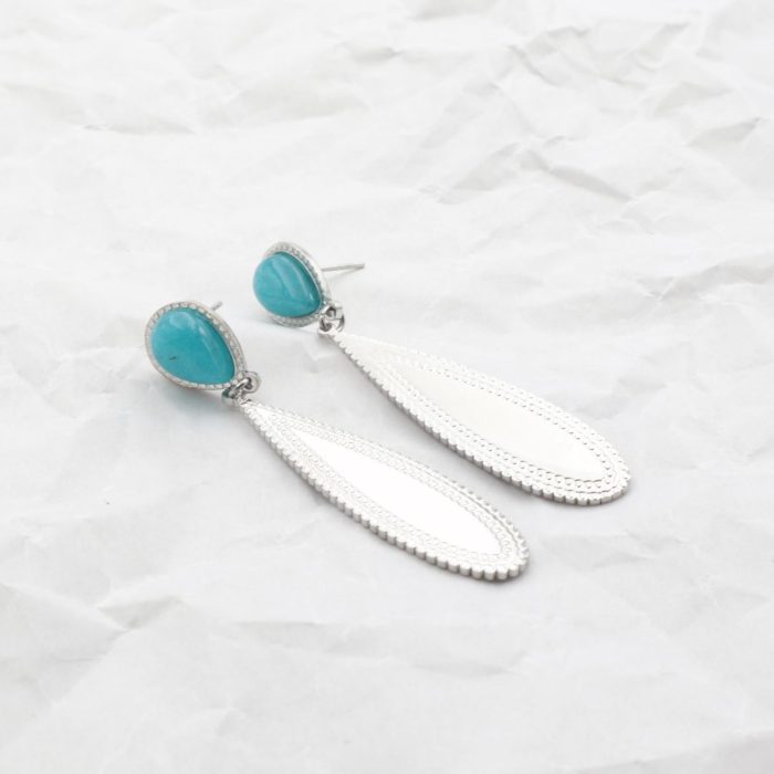 Ατσάλινα σκουλαρίκια με καρφάκι, με ιδιαίτερο σχέδιο κρεμαστού δακρύου κάτω από γαλάζια πέτρα, σε ασημί χρώμα.