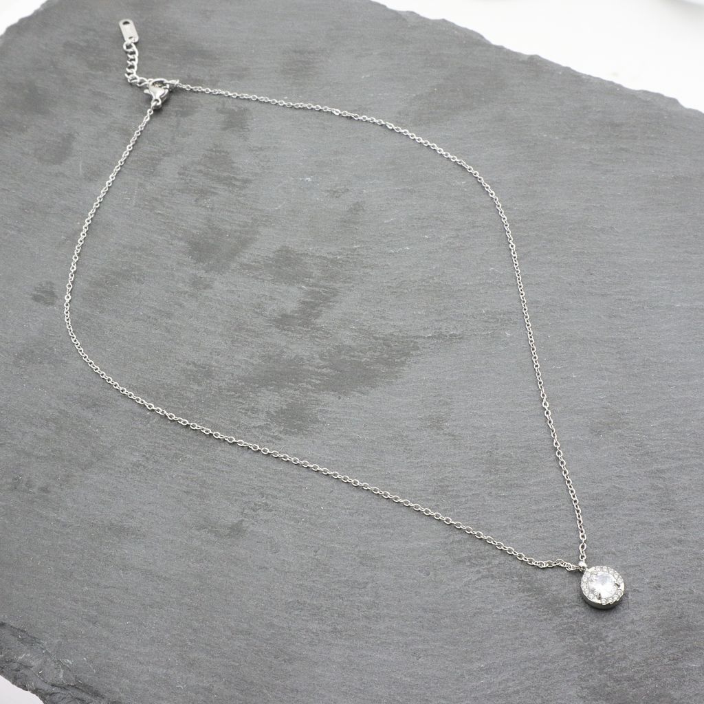 Κοντό ατσάλινο κολιέ με στρογγυλό κρύσταλλο, σε ασημί χρώμα