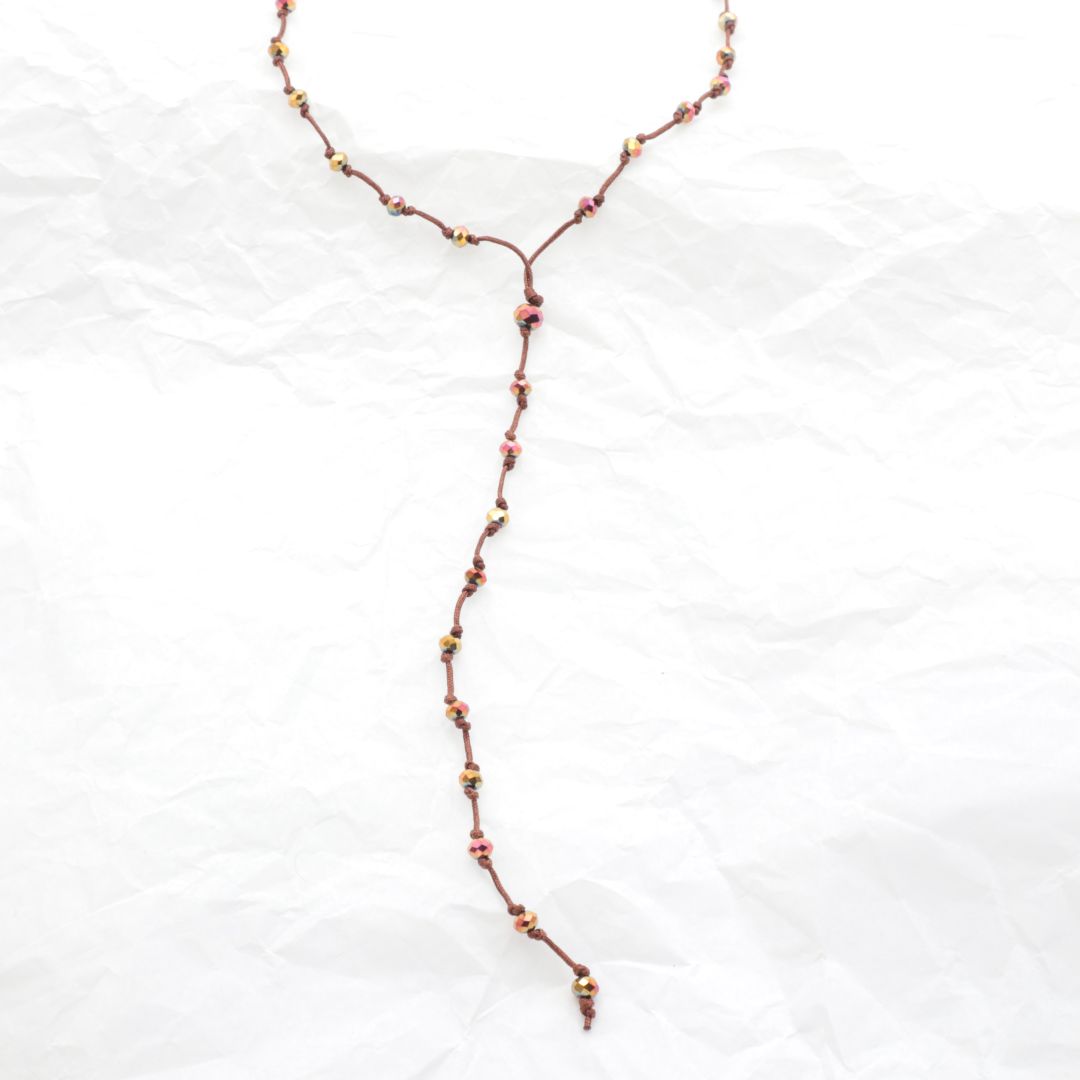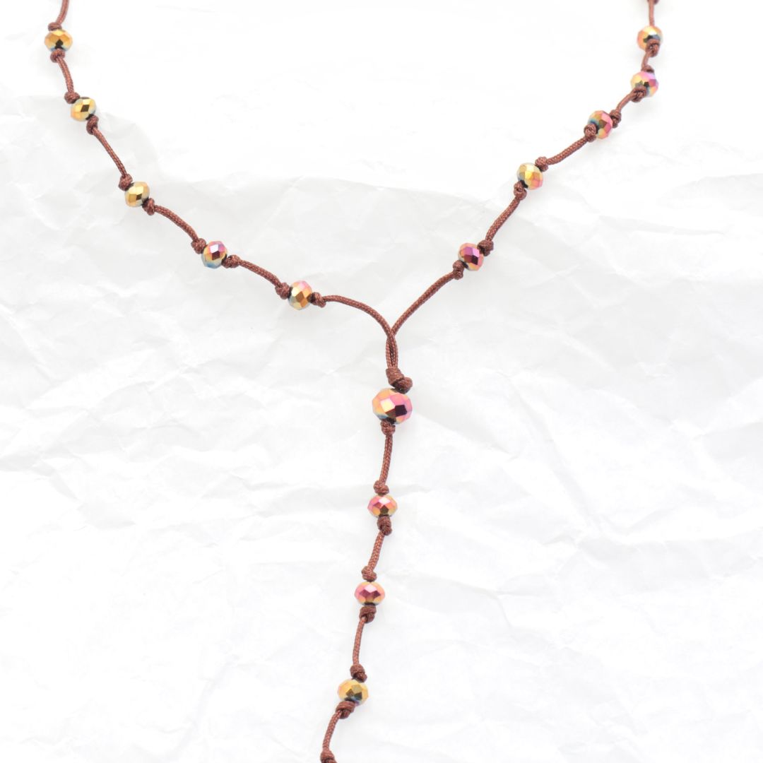 Χειροποίητο μακρύ κολιέ ροζάριο, πλεγμένο με καφέ λεπτό σχοινί και ιριδίζουσες μπρονζέ χάντρες.