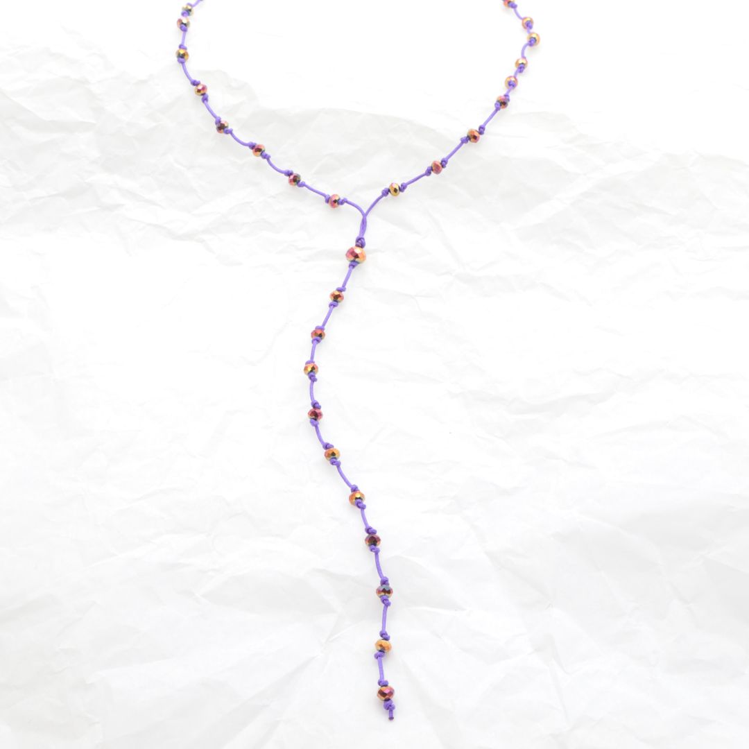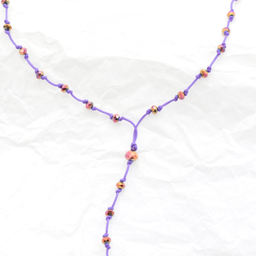 Χειροποίητο μακρύ κολιέ ροζάριο, πλεγμένο με μωβ-λιλά λεπτό σχοινί και ιριδίζουσες σομόν χάντρες.