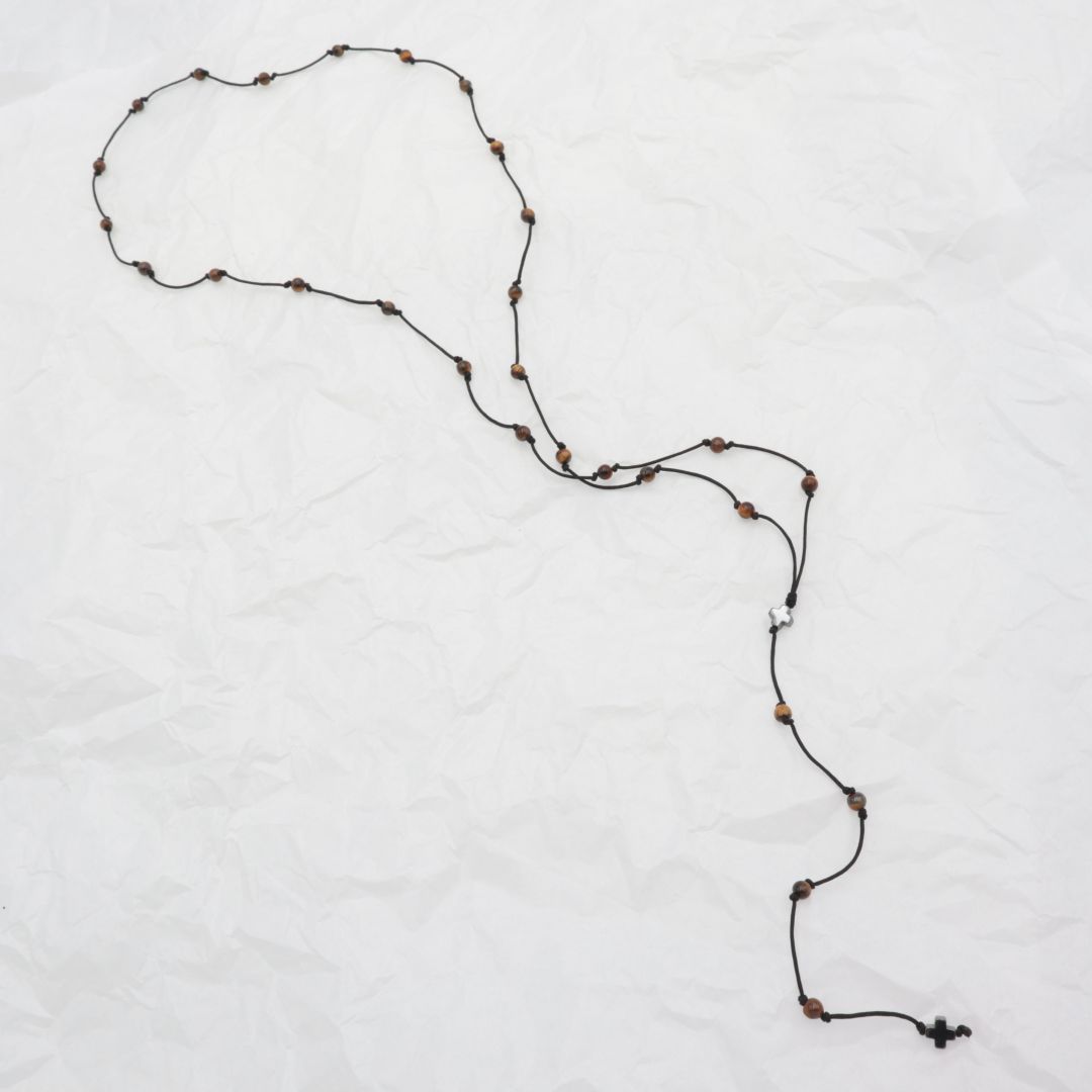Κολιέ ροζάριο φτιαγμένο στο χέρι με χάντρες tiger eye (μάτι του τίγρη), 2 χάντρες από αιματίτη σε σχήμα σταυρού και σχοινί.