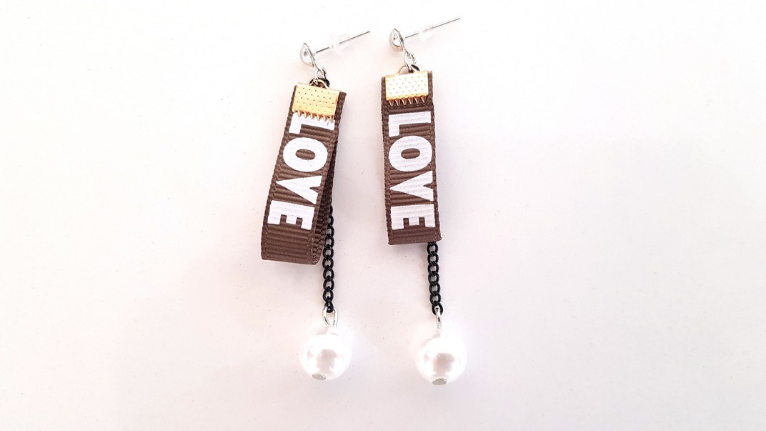 Κρεμαστά σκουλαρίκια με καρφάκι, με κορδέλα με τύπωμα LOVE και κρεμαστή μαύρη αλυσίδα που καταλήγει σε λευκή ακρυλική πέρλα.