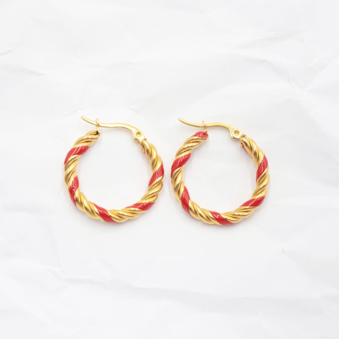 Στριφτοί ατσάλινοι κρίκοι, σε χρυσό χρώμα με επισμάλτωση σε χρώμα κόκκινο.
